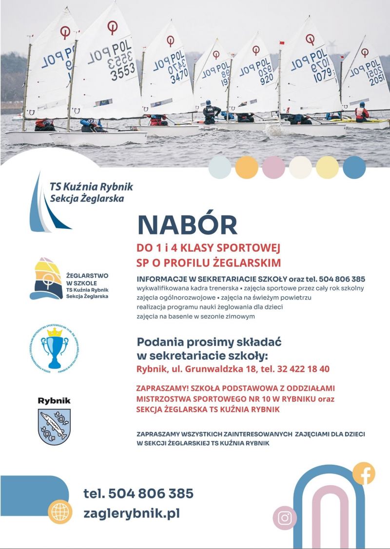 Wszelkie informacje na temat naboru do klas żeglarskich oraz zajęć żeglarskich dla dzieci prowadzonych przez sekcję Żeglarską TS Kuźnia Rybnik dostępne są pod numerem telefonu 504806385, na stronie www.zaglerybnik.pl oraz na https://www.facebook.com/profile.php?id=100063564281685
